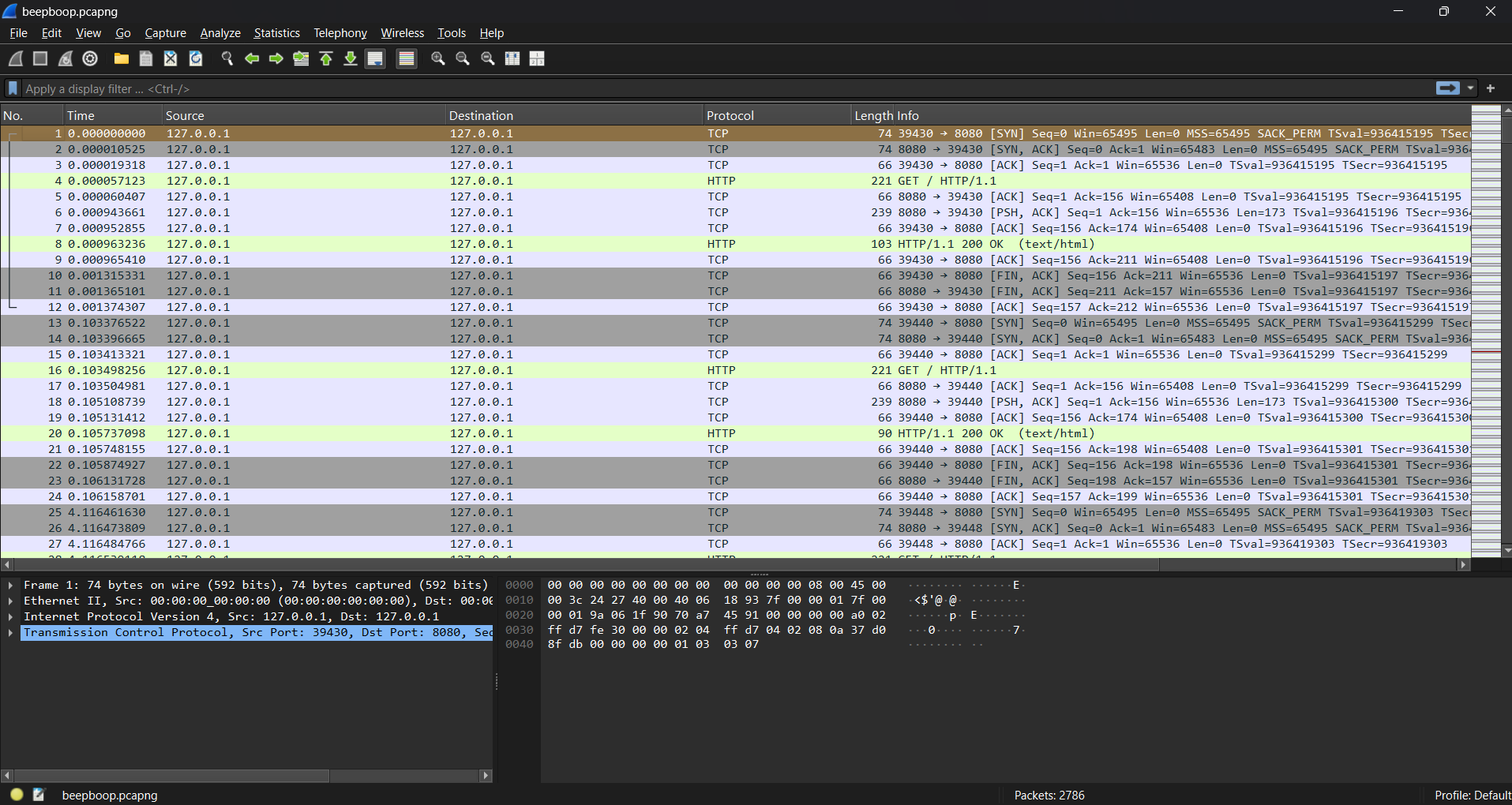 The PCAP contains multiple HTTP GET requests sent from a client to a local web server (127.0.0.1:8080). Using the following Wireshark display filter helps isolate them: