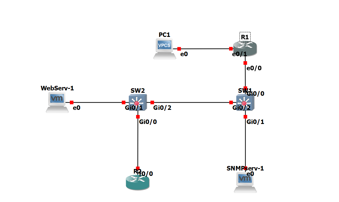 PC1: A virtual PC (VPCS) used for issuing SNMP queries and simulating user activity.