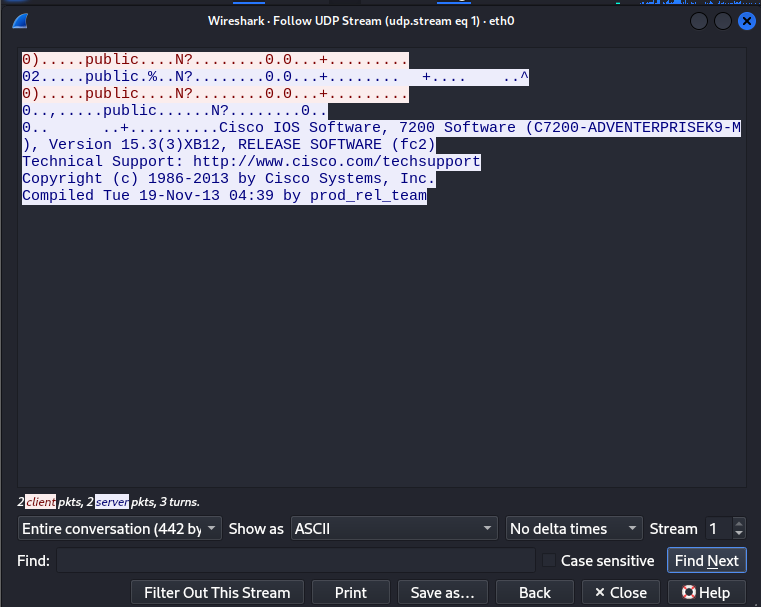 The community string (in this case, “public”) can then be reused by an attacker to issue their own SNMP queries and gather more information about the device, including: