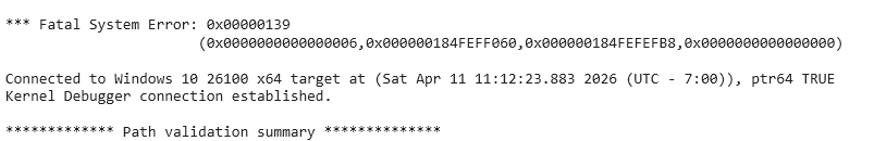 Notice that we explicitly pass NULL (xor rcx, rcx) as the DriverObject. Since the OS didn’t load us, we don’t have one. We fired the exploit. The shellcode executed. And the system instantly blue-screened.