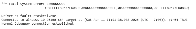 0xA is IRQL_NOT_LESS_OR_EQUAL. The kernel attempted to access a virtual address at a raised IRQL and the page wasn’t there. The first argument is the faulting address; the third (0x0) confirms this was a read, not a write.