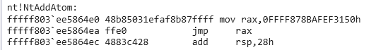 Next we use the physical write primitive to overwrite the start of NtAddAtom with our trampoline.