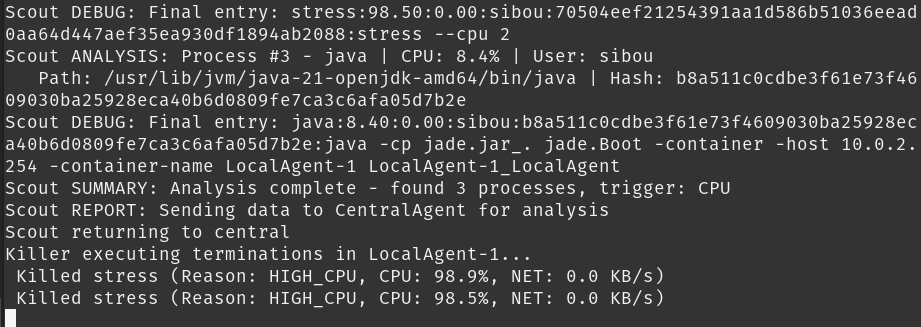 Once a target is positively identified as hostile, the CentralAgent deploys the Killer Agent. This agent acts as a guided missile. It is initialized with a specific “Warrant” (the process name or PID) and migrates to the infected node.