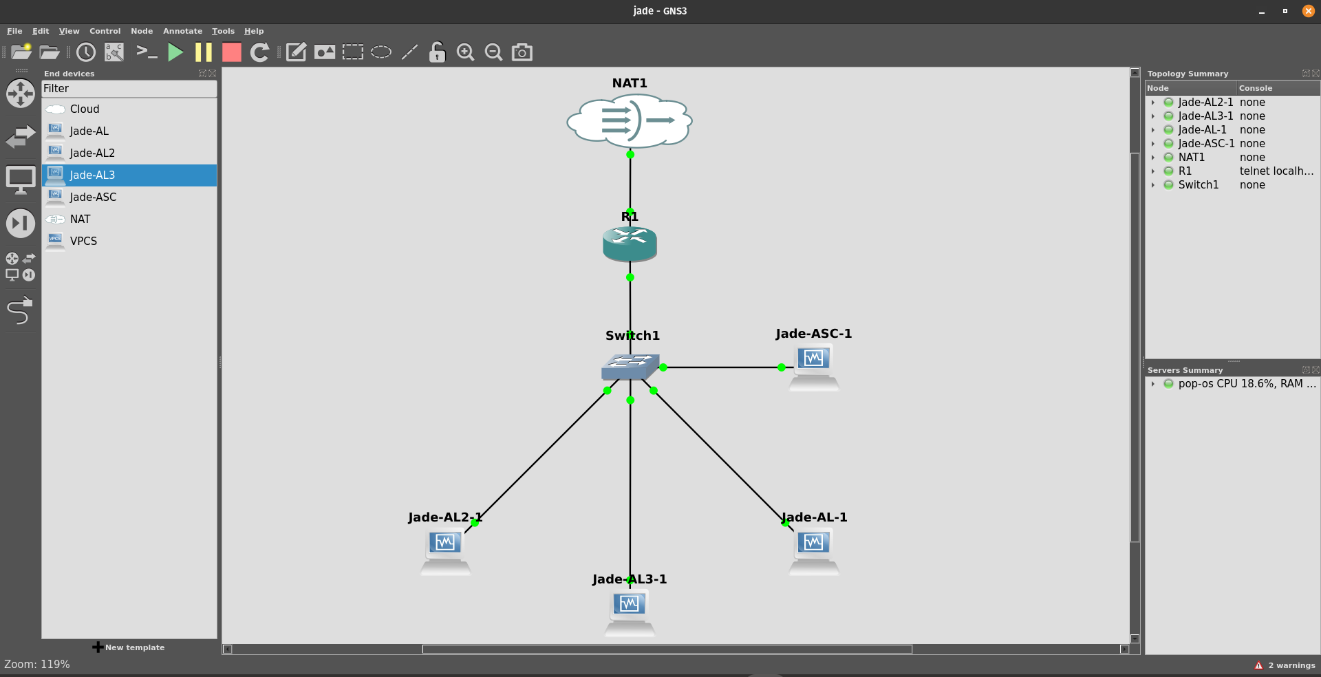 The figure below presents the final state of the network simulated in GNS3, integrating the edge router, the switch, and the four interconnected virtual machines.