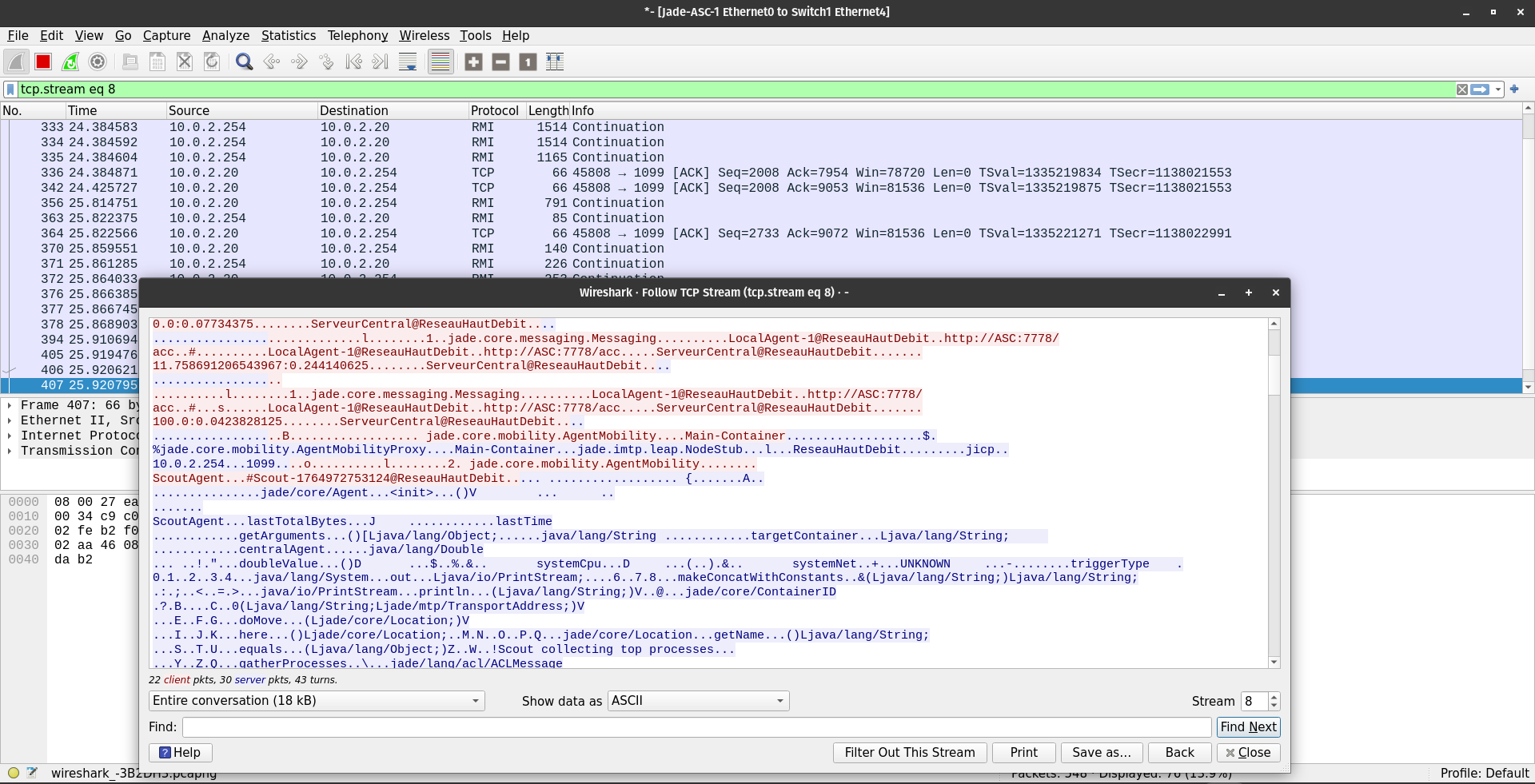 - Payload Obfuscation: The “Data” field of every packet is encrypted noise. Neither the JVM headers, the ACL Message content, nor the Mobile Agent bytecode are visible.