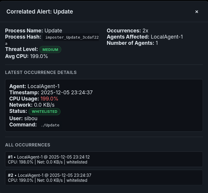 Observation: The Central Agent allowed the process to run because the name was in the whitelist. However, the Forensic Dashboard, which cross-references the file hash returned by the ScoutAgent against the known-good database, triggered a Critical Integrity Violation alert.