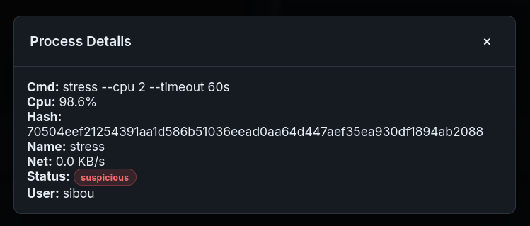 Observation: The Dashboard’s Network graph accurately reflects the throughput spike (100 MB/s). Crucially, because the process causing the traffic was whitelisted (simulating legitimate VoIP), the system did not kill the process but flagged it for review, demonstrating the whitelist logic’s effectiveness.