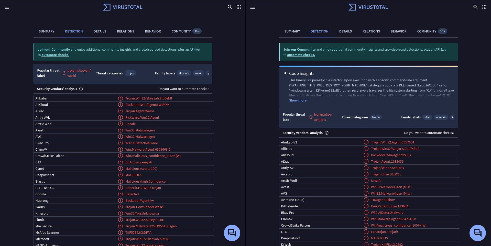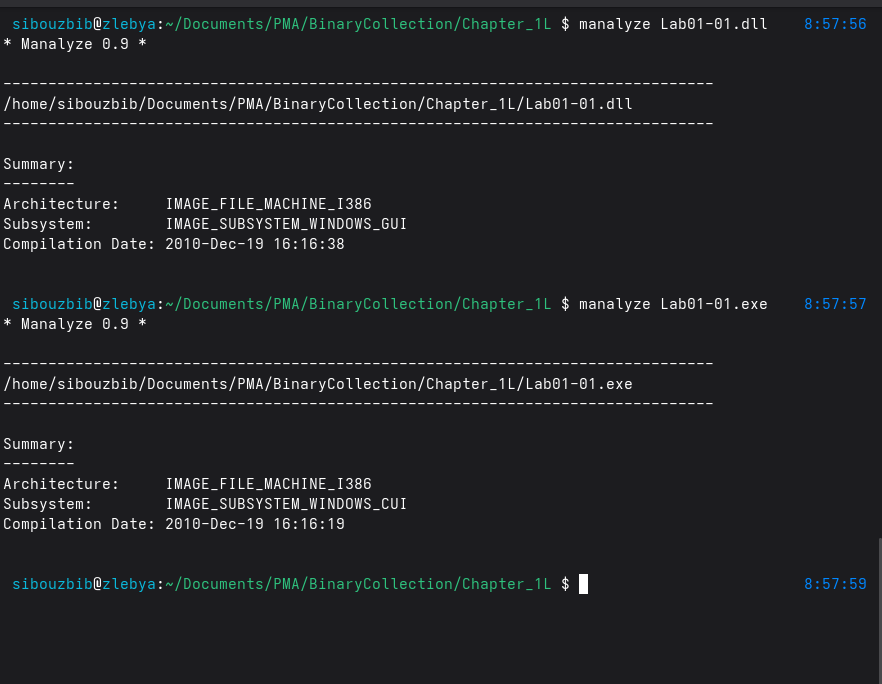Lab01-01 has a compilation timestamp of 2010-12-19 16:16:19 UTC, and Lab01-01.dll has a compilation timestamp of 2010-12-19 16:16:38 UTC; both were compiled approximately at the same time.