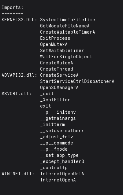 The imports from KERNEL32.dll provide additional context. Functions like CreateThread indicate that the malware is multi-threaded, allowing it to perform background tasks independently, such as networking or persistence checks. CreateMutexA and OpenMutexA are commonly used to ensure only one instance of the malware runs at a time, preventing duplicates or accidental re-infection. Functions such as CreateWaitableTimerA, SetWaitableTimer, and WaitForSingleObject suggest that the program may delay execution, schedule repeated actions, or synchronize internal operations, which is consistent with background service-like malware behavior.