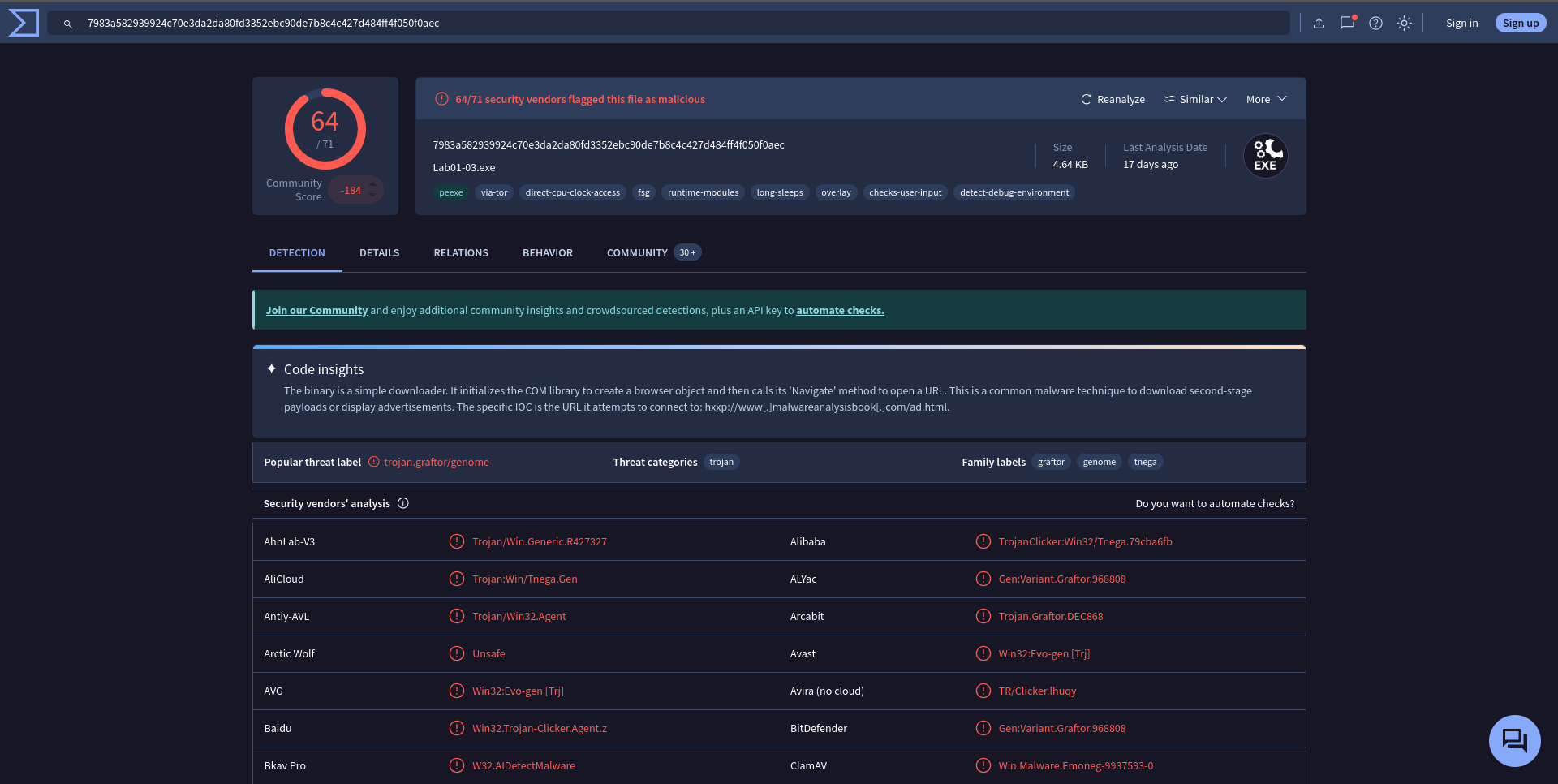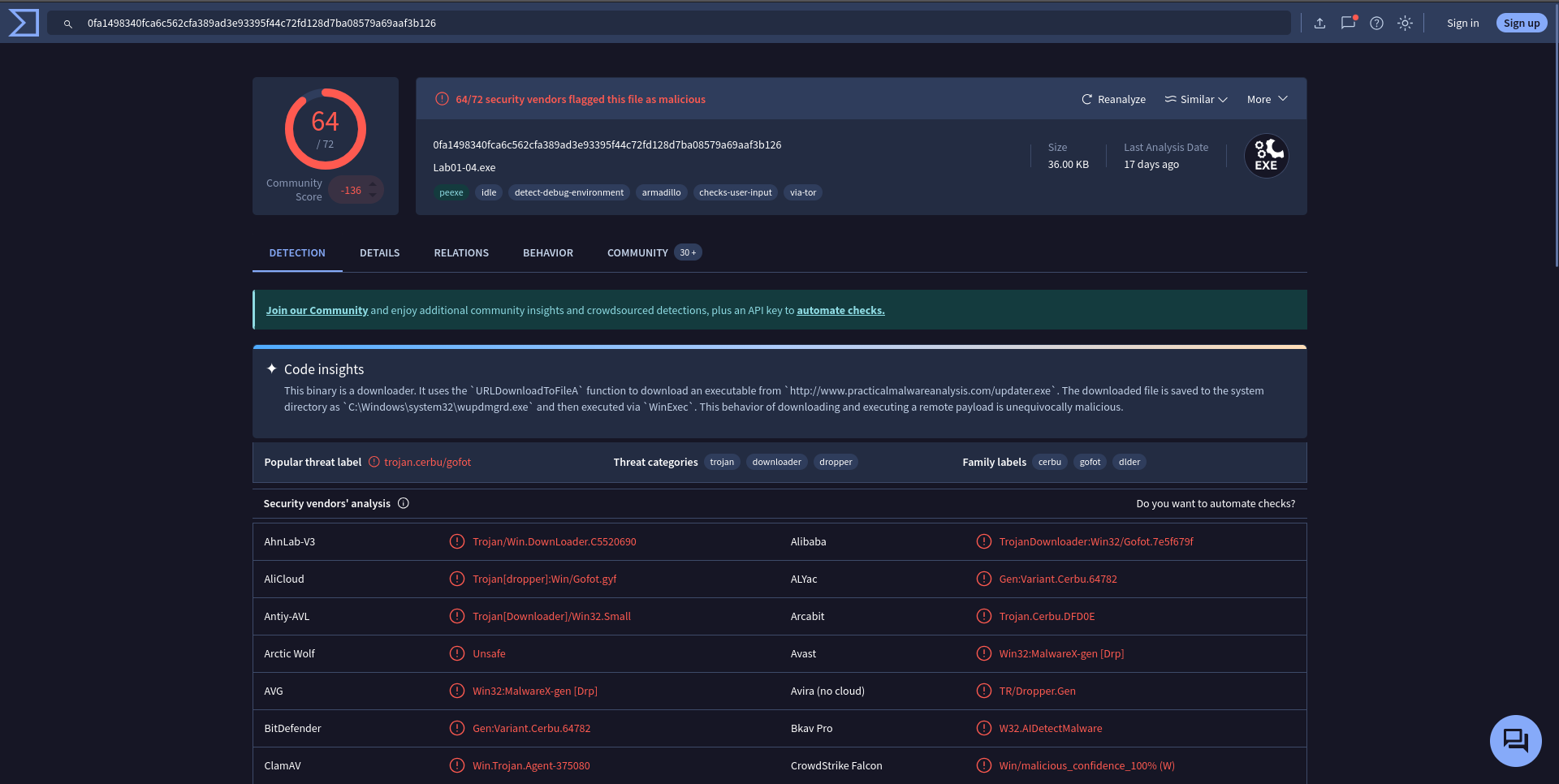 The exe matches multiple existing AV definitions and is flagged by 64 out of 72 AVs.