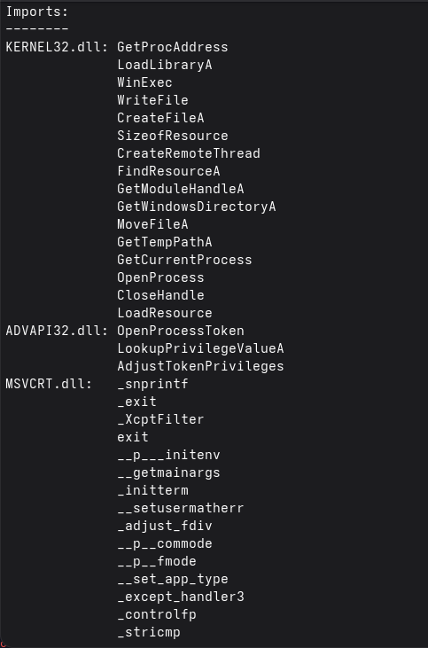 Several of these imports give strong hints about what this program is designed to do. The imports from KERNEL32.dll reveal that the malware is performing both file and process manipulation. Functions like CreateFileA, WriteFile, MoveFileA, GetTempPathA, and GetWindowsDirectoryA indicate that the program reads, writes, and moves files across the system, possibly to copy itself or drop additional payloads. The presence of WinExec, CreateRemoteThread, and OpenProcess suggests it can launch other programs or inject code into running processes, which is a common behavior for malware that wants to execute payloads stealthily.
