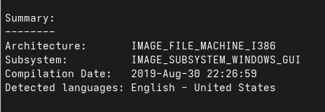 First thing we notice when we run the manalyze command is the compilation time, 2019-Aug-30. As of the time of writing, this date might seem logical. But then let’s remember that the github repo for the book wasn’t update in 8 years, and virus total scan indicates that time this malware was First Seen In The Wild is 2011-07-05 18:16:16 UTC. So we can’t deduce its compilation time.