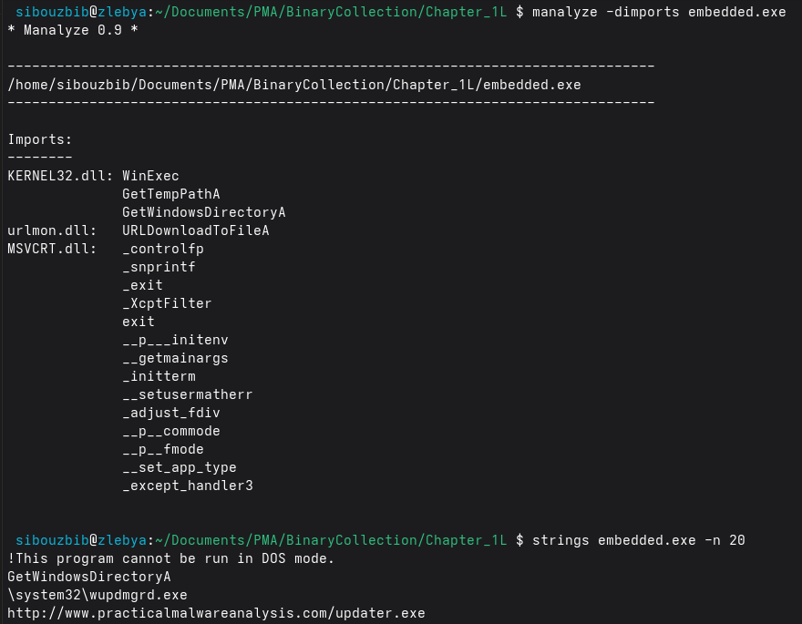 Network‑based indicators are even more direct, since the embedded second‑stage executable includes URLDownloadToFileA from urlmon.dll and contains a hardcoded download URL: http://www.practicalmalwareanalysis.com/updater.exe. In a real attack, this would point to an attacker‑controlled server hosting additional payloads. Any outbound HTTP request to an unusual or untrusted domain , especially one requesting a file named “updater.exe”, would be a clear sign of an infection attempt.