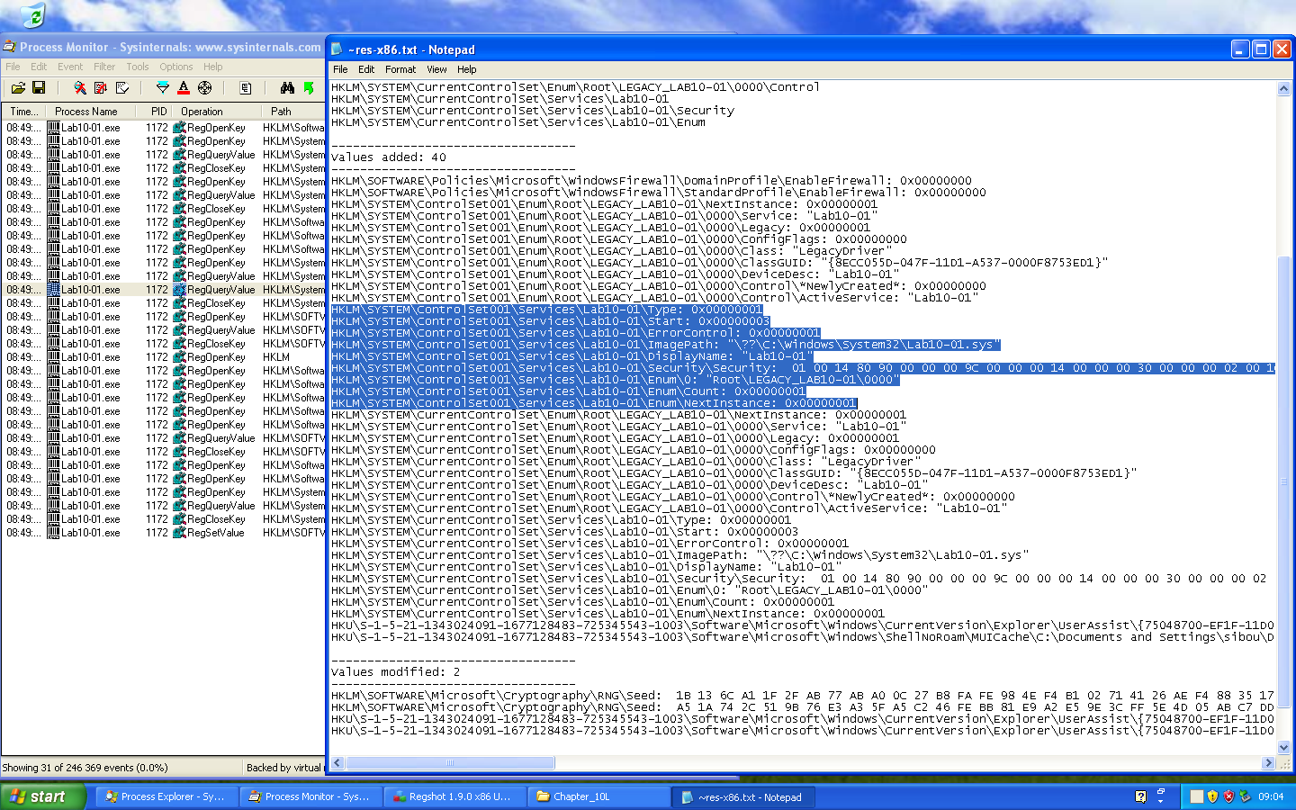 Although the Process Monitor (Procmon) output primarily displayed RegQuery and RegOpen operations, which may initially suggest passive behavior, the Regshot comparison proves that Lab10-01.exe successfully modified the system configuration. This discrepancy is a common indicator that the malware is utilizing high-level Windows APIs (such as CreateService) or interacting with the Service Control Manager (SCM). In such cases, the malware process itself only “queries” or “opens” keys to verify state, while the actual “write” operations are executed by a legitimate system process (like services.exe) on its behalf, effectively masking its direct footprint in Procmon.
