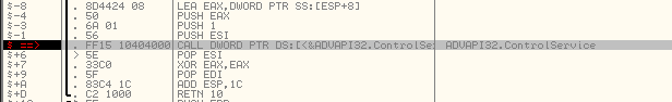 Analysis in IDA Pro reveals that the user-mode executable Lab10-01.exe calls ControlService at the end of its execution. According to the Windows API documentation, this function sends a control code to a service. In this specific case, the Control parameter is set to 1, which corresponds to the constant SERVICE_CONTROL_STOP.