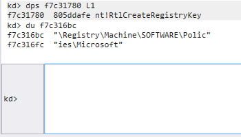 The call at f7c314a0 is to nt!RtlCreateRegistryKey. The malware is ensuring that the following registry path exists: \Registry\Machine\SOFTWARE\Policies\Microsoft