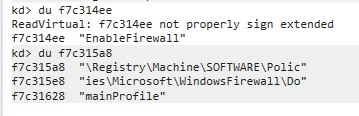 The malware prepares a DWORD value of 0 (seen in the local variable initialization) and writes it to the EnableFirewall value name within both the DomainProfile and StandardProfile keys.