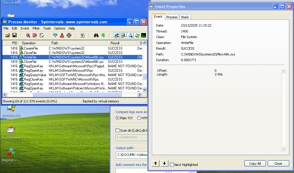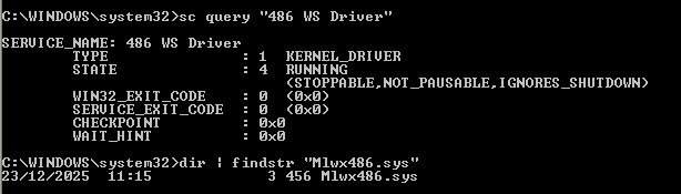Mlwx486.sys is the kernel-mode component of this threat. Its presence indicates a classic “Loader-Driver” architecture: the user-mode executable acts as an installer that extracts the driver, loads it into the kernel, and then terminates. Analysis of Regshot provides the “Paper Trail” for the driver’s installation: