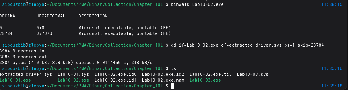 We should mention that you can extract the sys file using binwalk on the exe file since it is hidden inside its resources section: