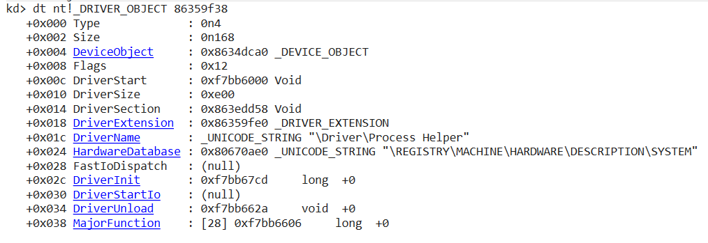 Using WinDbg attached to the victim’s kernel, I queried the driver object for “Process Helper” after locating its address: