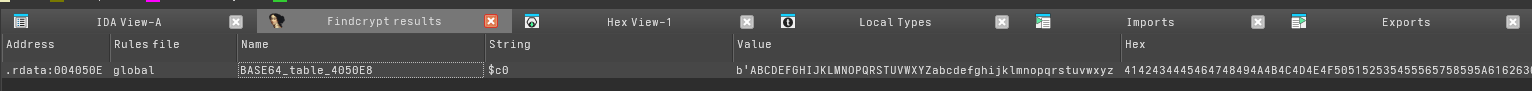 Using FindCrypt, only one encoding mechanism is detected: Base64. This aligns with what we observed dynamically, where the malware Base64-encodes the path sent to the C2 server.