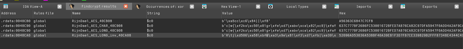 From the FindCrypt results, tables with the suffix inv indicate decryption logic, while their counterparts represent encryption. The previously identified XOR routines were renamed based on their roles: enc_xor2 / enc_xor4 for encryption and dec_xor3 / dec_xor5 for decryption.