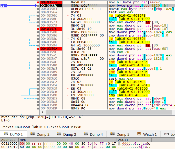First, we change the BeingDebugged flag in the PEB to 0. Following the EAX+2 offset lands on the byte that is initially 0x01, indicating a debugger is attached.