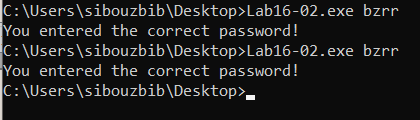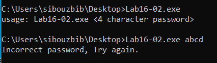 The program functions as a simple password checker. When executed from the command line, it expects a single argument, a four-character password. If you provide an incorrect guess, the program simply displays an “incorrect password” message and exits without revealing any additional information about the expected input.