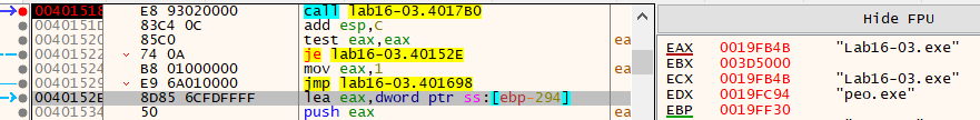 bypasses this check. Breaking on the strncmp afterward shows the correct filename should be peo.exe.