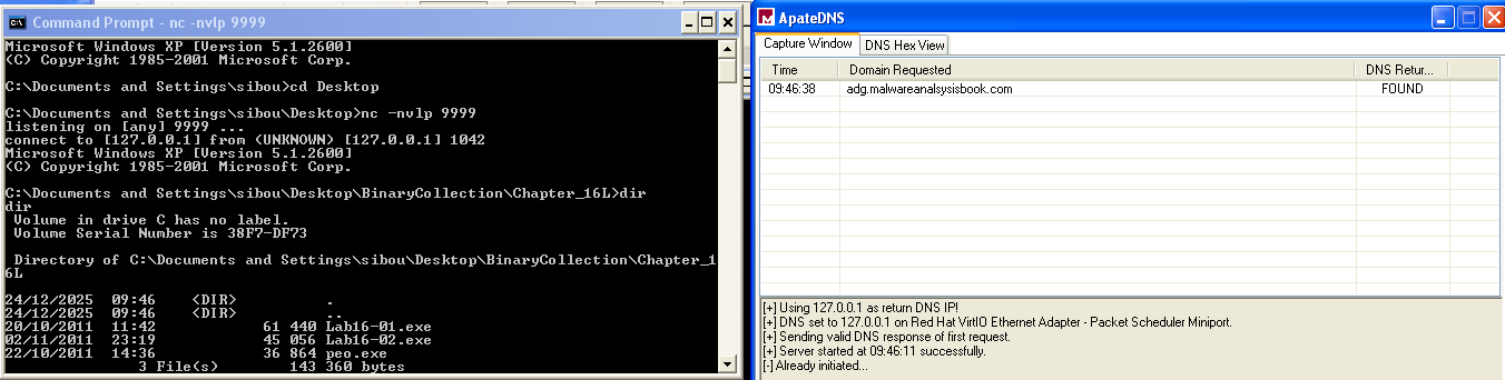 To confirm, the file was renamed to peo.exe and a listener was set on port 9999, which is the port used after DNS resolution. Immediately, the domain resolved and the listener received a reverse shell connection.
