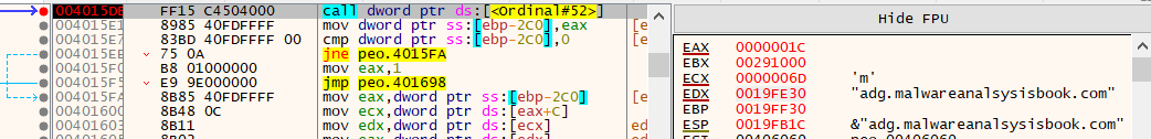 Next, the malware prepares a DNS lookup. The hostname is built dynamically. Breaking before gethostbyname causes the malware to delete itself and exit.