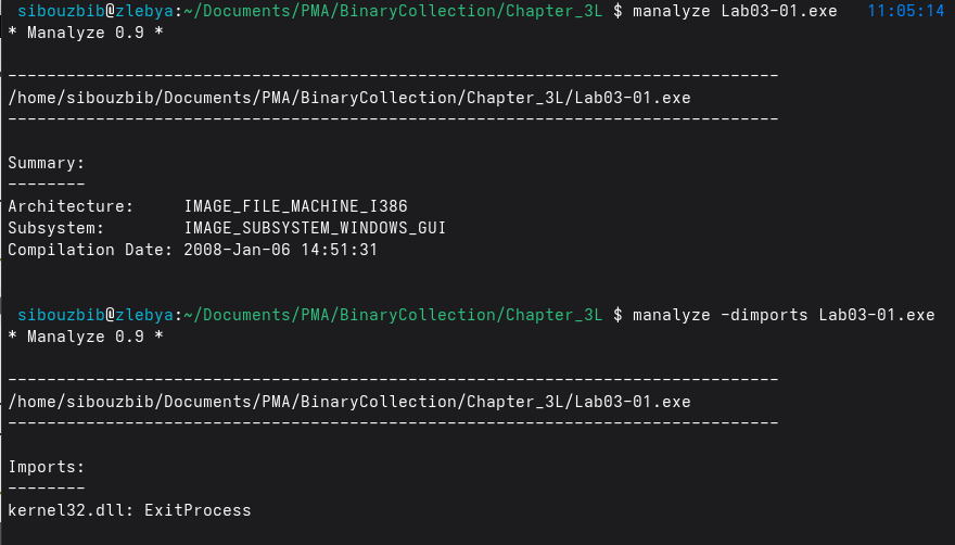 Running manalyze on the sample shows only a single imported function: