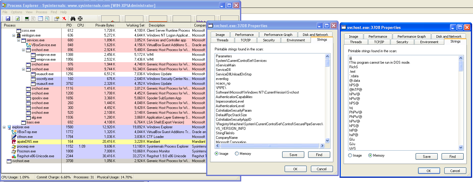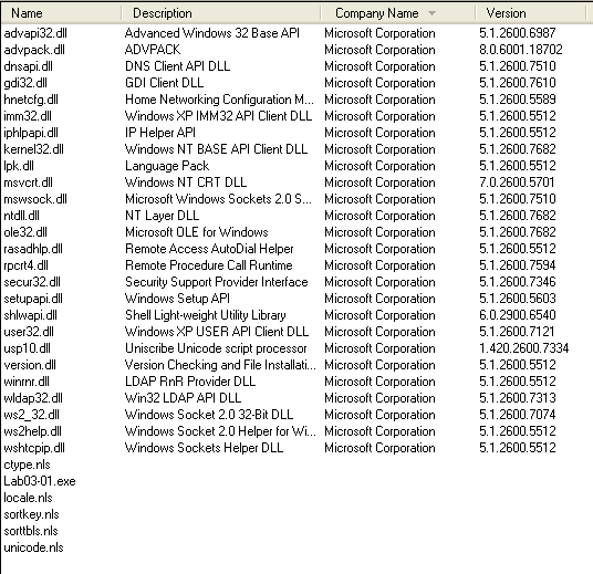 For this analysis, I executed the sample on my Windows XP VM and observed its behavior using ProcMon, Process Explorer, and Regshot. Despite the static import table showing only kernel32.dll, Process Explorer’s lower pane reveals a long list of dynamically loaded DLLs.