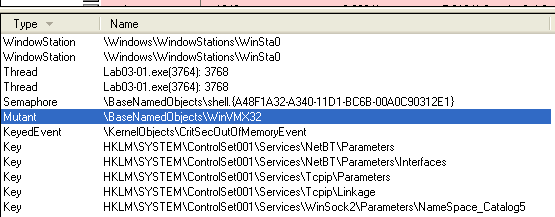 Process Explorer also shows a new mutant name under the handles view: \BaseNamedObjects\WinVMX32, which the malware likely uses for mutex‑based instance control or stealth.