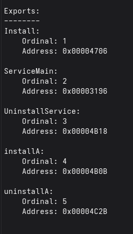 First Let’s statically analyse the malware. Checking its exports, we see that the dll installs itself as a service, as evident by the functions InstallA and ServiceMain.