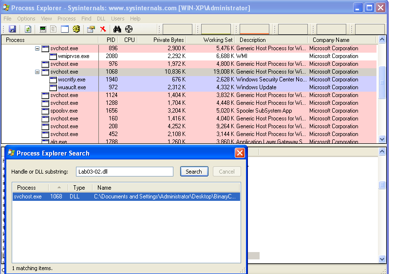 To identify the process loading the malicious DLL, we searched for Lab03‑02.dll in Process Explorer. As expected, it was loaded by an svchost.exe instance. This is useful because it gives us the PID we would need for filtering in Procmon, although in this case, Procmon did not reveal any additional meaningful activity.