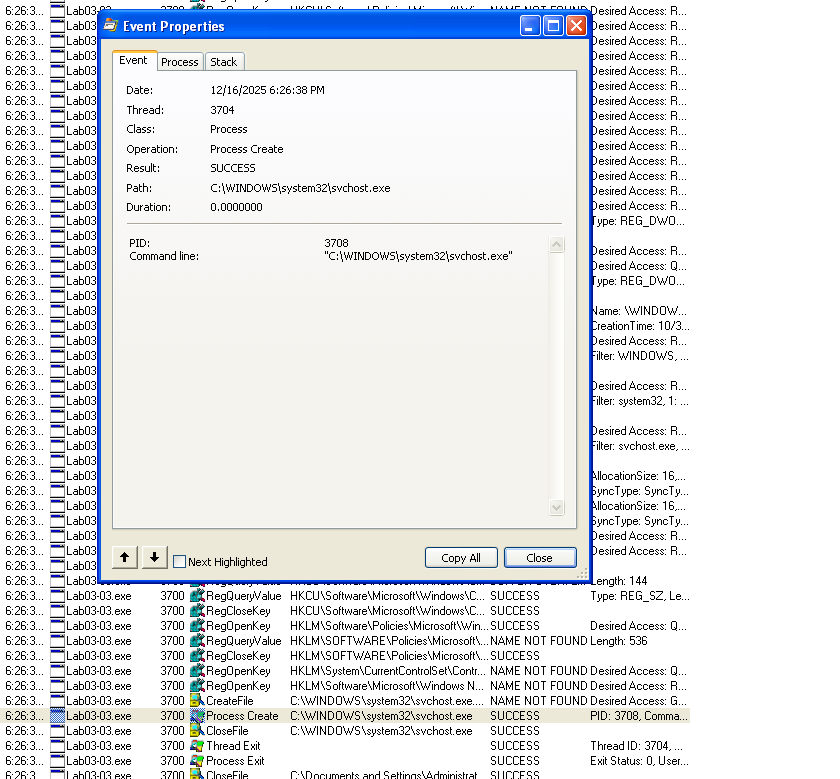 Using Process Monitor and filtering on Lab03-03.exe, we see that the malware creates a new process at: C:\WINDOWS\system32\svchost.exe