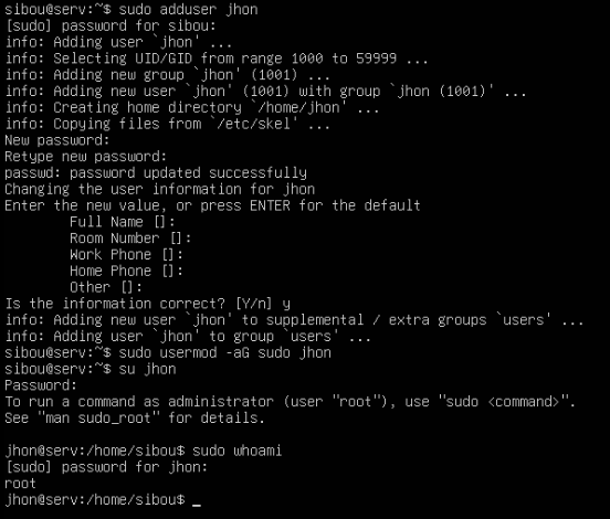 This command creates a new user and prompts you to set a password. The system will also ask for optional user details (full name, room number, etc.).