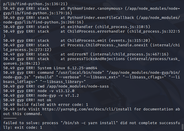 After fixing the build environment, the next failure involved an incompatible version of node-sass. The project was attempting to use a version (^7.0.0) that was not compatible with the underlying Node version in the container.