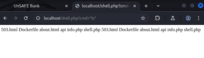 Now the moment of truth: I visited http://localhost/shell.php?cmd=ls. If everything had worked, this should execute the ls command on the server and return the result. And it did.